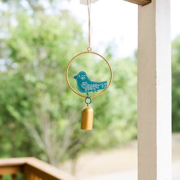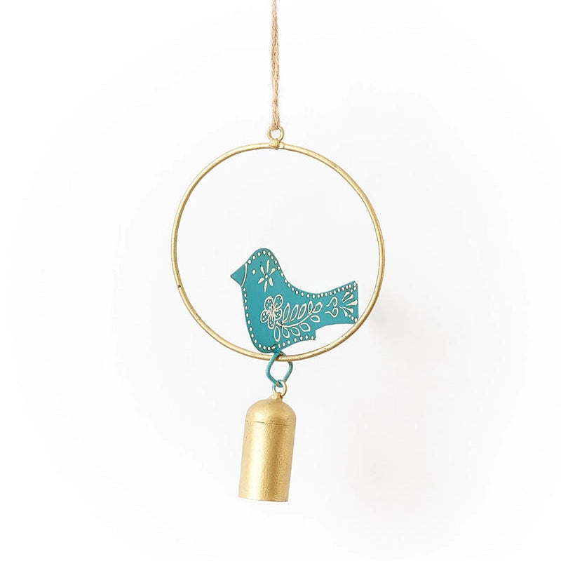This delightful, fair trade metal wind spinner is ethically handcrafted in India using age-old metal craft and bell making techniques. Master artisans skillfully cut and hammer upcycled metal materials to use in hand-shaping the bells. The bells are coated in powdered brass and copper then fired in kilns. This unique, nature inspired outdoor bell chime features a hand painted bird charm handcrafted with upcycled metal, perched within a clean line hoop. The bird charm is intricately hand painted using non-toxic paints, featuring a floral motif inspired by henna design. A handcrafted 3” Indian cow bell hangs below the bird charm, as if clutched by the bird’s feet. The piece includes a sturdy jute hanging loop.