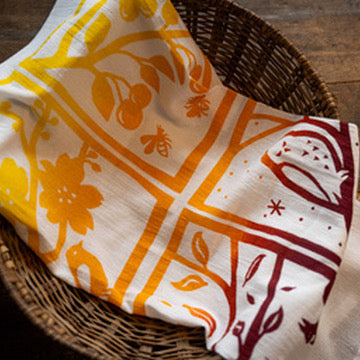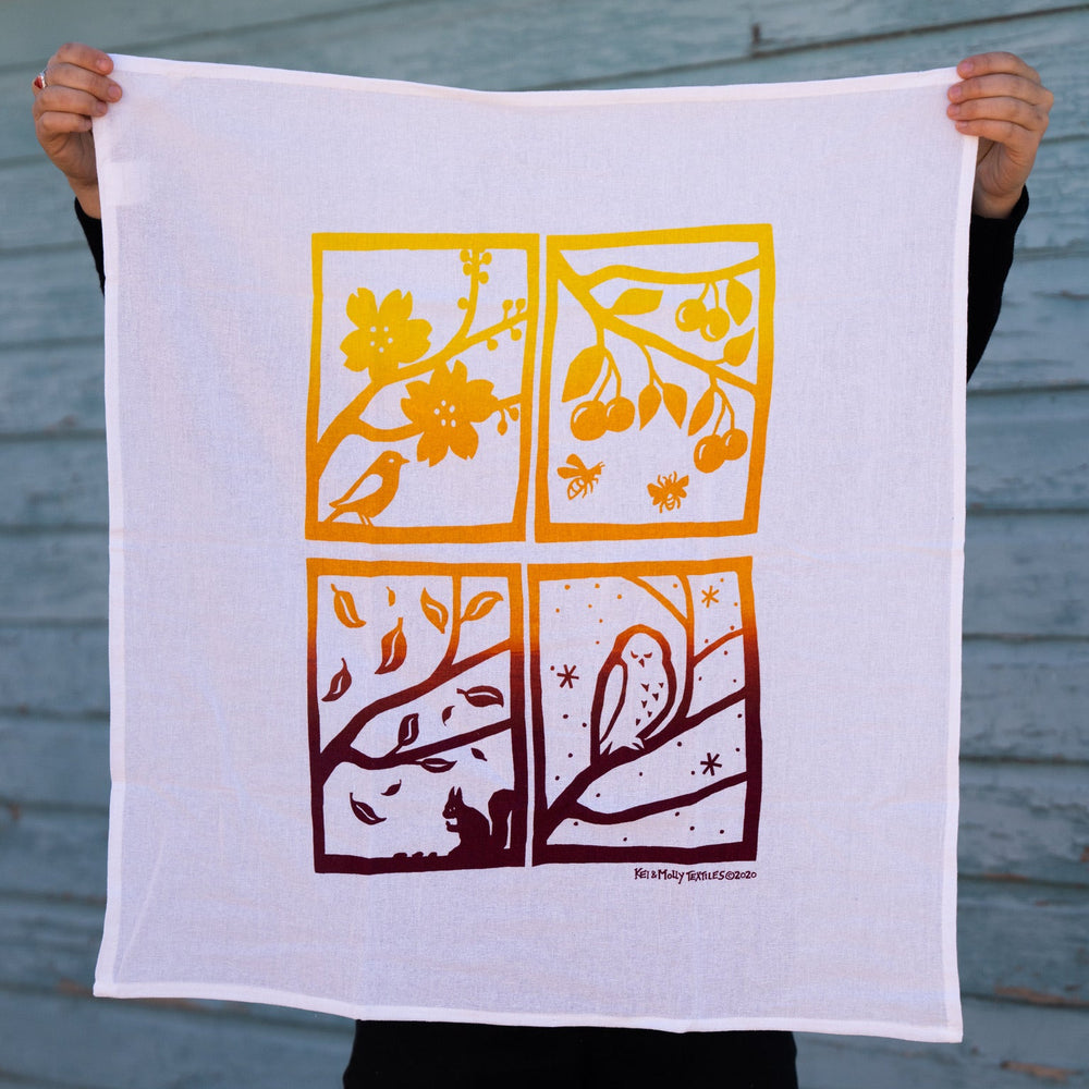 Our Seasons flour sack dish towel design has all four seasons represented on one towel in a beautiful Dusty Rose color, told through the Sakura cherry blossom tree. Spring time starts with the Sakura flower blooming and the birds enjoying the branches. Next is summer with the cherries ripening and the bees buzzing. The fall represents change and transition with the shedding of the leaves and squirrels foraging for hibernation. Followed by the still of the winter with the hoots of the owl by the moon, perched on its barren tree.