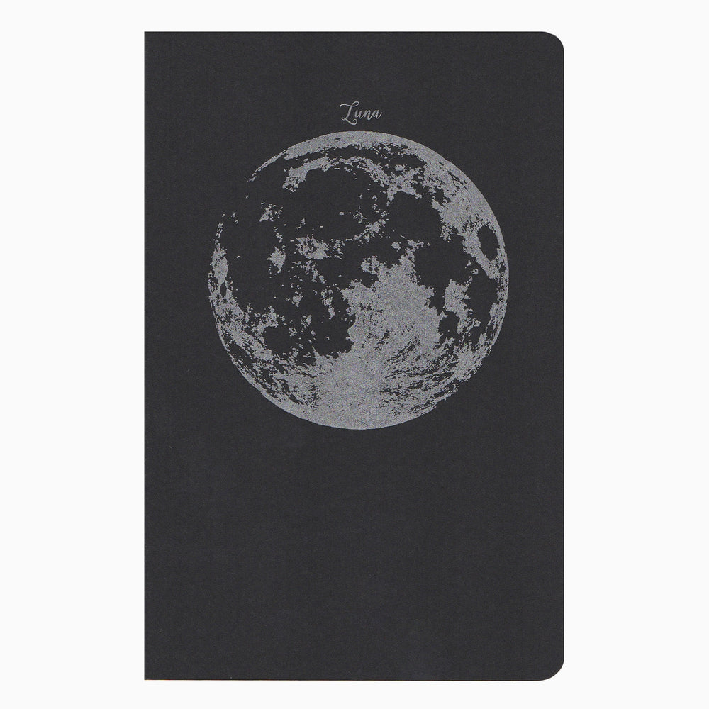 Luna- Features a large moon with small print "Luna" above. Cover is letterpress printed in silver ink with original illustration on 100# black paper