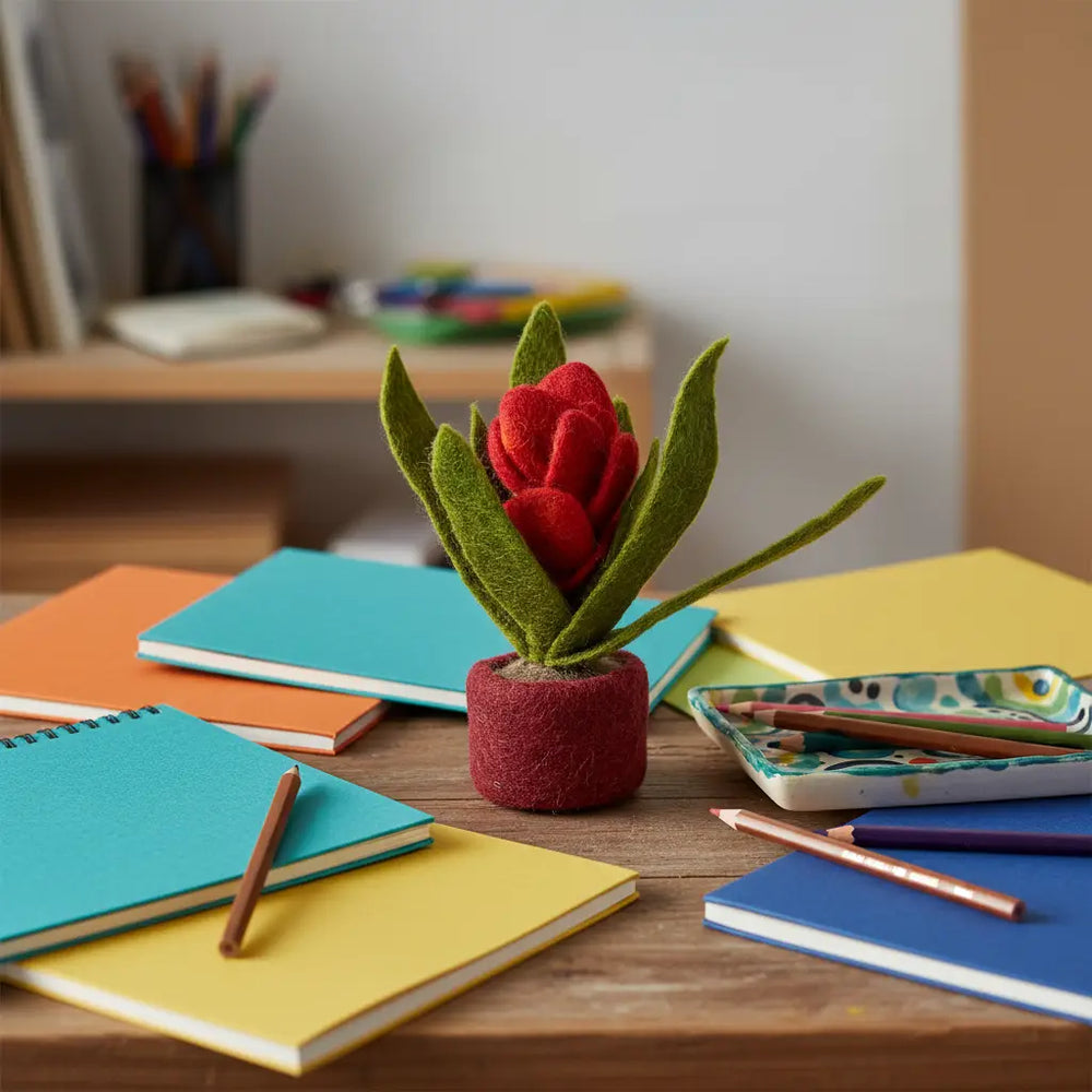 This vibrant Juna Tropical House Plant is a delightful felt creation, featuring lush green leaves and a fiery red-and-orange bloom that brings a pop of color to any space.