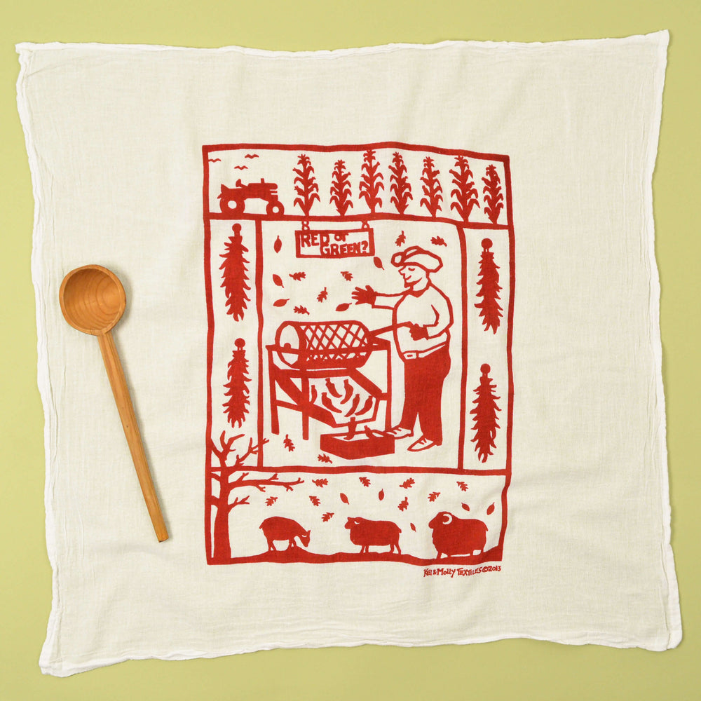 Have you ever been to New Mexico in fall? Well, you're in for a treat because fall is the time when our famous green chile gets roasted and the air fills with a sweet, fragrant smell that makes any New Mexican take a deep breath, smile and say "Aaaaaahhhhh!" You may not know this about us, but we love chile on everything. The only decision we have to make  every day is whether it should be red or green chile. Hence the question on the dish towel: Red or Green? If you go to any New Mexican restaurant you'll be asked that question. Some people stick to their favorite and never switch;  others prefer "Christmas" and pile on both. The two chiles have very distinctive flavors so you need to try them both, and some years one is far hotter than the other, but you'll figure that out!