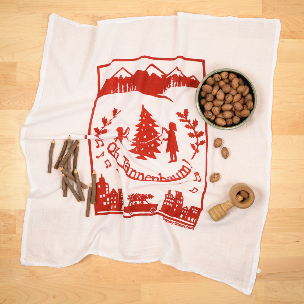 Our Tannenbaum flour sack dish towel is a favorite around the holidays and even used as reusable gift wrap by many. Other holiday favorites include our Pomegranate design, Toy Train, Hot Cocoa and Winter Animals, just to name a few.